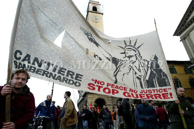 | Uno striscione di protesta contro la guerra in Iraq e contro gli USA sfila nei lungarni della citt‡ durante la manifestazione provinciale di Pisa organizzata dai sindacati e associazioni Cobas, Rifondazione, Collettivi, Legambiente, Disobbedienti e Stop Global Word, giovedÏ 20 marzo 2003. (AP photo FABIO MUZZI) | IMAGE_1775.JPG | 20/03/03 19.03 | |