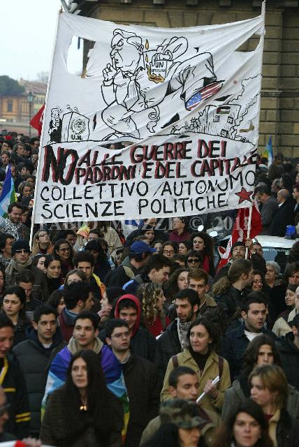 | Uno striscione di protesta contro la guerra in Iarq e contro il presidente americano George Bush sfila nei lungarni della citt‡ durante la manifestazione provinciale di Pisa organizzata dai sindacati e associazioni Cobas, Rifondazione, Collettivi, Legambiente, Disobbedienti e Stop Global Word, giovedÏ 20 marzo 2003. (AP photo FABIO MUZZI) | IMAGE_1778.JPG | 20/03/03 18.57 | |
