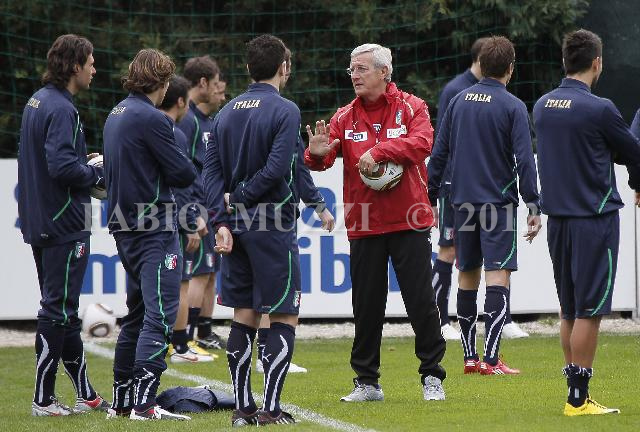 | ITALY, Florence : Italy's national footbal coach team Marcello Lippi ( in red) speaks to his players during a training session on March 01, 2009 at the national technical center of Coverciano, near Florence. Italy will face Camerun on March 03 in a friendly match in Monaco. AFP PHOTO / FABIO MUZZI | IMAGE_3803.JPG | 01/03/10 15.46 | |