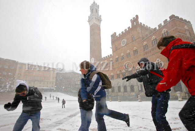 | ITALY, Siena : people joke with the snow in the main square "il Campo" and the Council of Siena town in background, central Italy. From this morning the snow covered great part of the region on March 09, 2010 (AFP PHOTO / FABIO MUZZI) | IMAGE_3822.JPG | 09/03/10 13.30 | |
