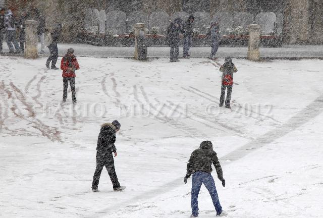 | ITALY, Siena : people joke with the snow in the main square "il Campo" of Siena town, central Italy. From this morning the snow covered great part of the region on March 09, 2010 (AFP PHOTO / FABIO MUZZI) | IMAGE_3823.JPG | 09/03/10 13.34 | |
