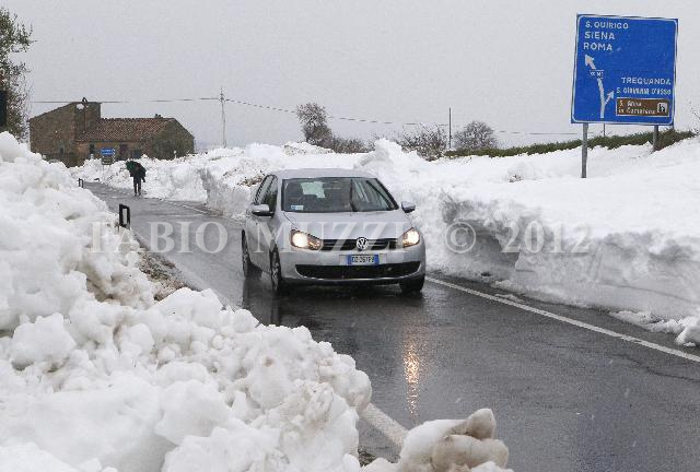 | ITALY - Pienza : a car travels along a Cassia road fully covered by snow near Pienza tuscany medieval village in Orcia valley, central Italy, on March 11, 2010. Tuscany and central Italy has been shocked by an extraordinary adverse meterological weather included of one or more meter height of snow. AFP PHOTO / FABIO MUZZI | IMAGE_3824.JPG | 11/03/10 7.59 | |