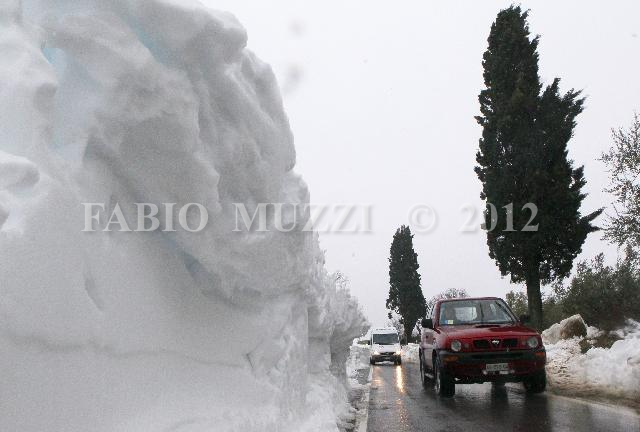 | ITALY - Pienza : a car travels along a Cassia road fully covered by snow near Pienza tuscany medieval village in Orcia valley, central Italy, on March 11, 2010. Tuscany and central Italy has been shocked by an extraordinary adverse meterological weather included of one or more meter height of snow. AFP PHOTO / FABIO MUZZI | IMAGE_3825.JPG | 11/03/10 8.02 | |