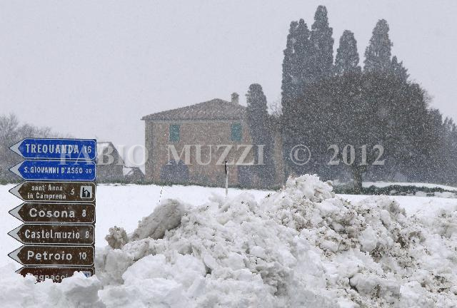 | ITALY - Pienza : a view of tuscany farm surrounding fully covered by snow near Pienza tuscany medieval village in Orcia valley, central Italy, on March 11, 2010. Tuscany and central Italy has been shocked by an extraordinary adverse meterological weather included of one or more meter height of snow. AFP PHOTO / FABIO MUZZI | IMAGE_3826.JPG | 11/03/10 8.10 | |