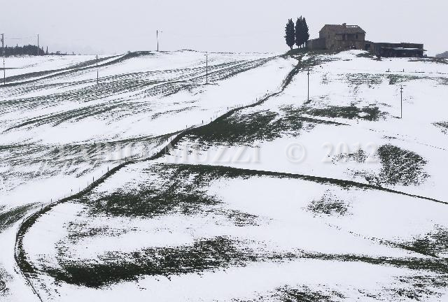 | ITALY - Pienza : a view of tuscany farm surrounding fully covered by snow near Pienza tuscany medieval village in Orcia valley, central Italy, on March 11, 2010. Tuscany and central Italy has been shocked by an extraordinary adverse meterological weather included of one or more meter height of snow. AFP PHOTO / FABIO MUZZI | IMAGE_3827.JPG | 11/03/10 8.25 | |