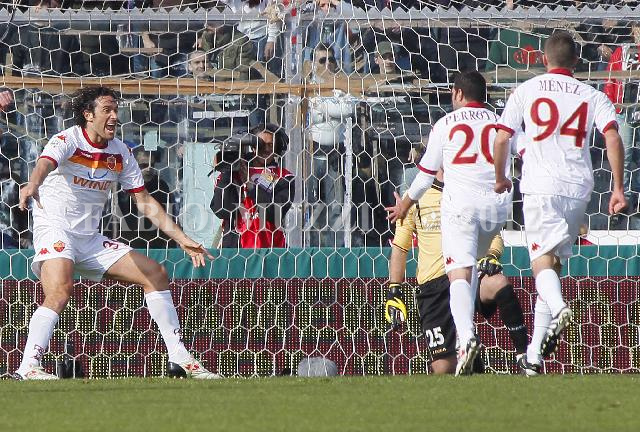 | ITALY, Leghorn : Roma's Luca Toni (L) celebrates with teammates after scoring against Livorno during their seria A soccer match at Armando Picchi stadium in Leghorn, on March 13, 2010. (AFP PHOTO / FABIO MUZZI) | IMAGE_3838.JPG | 14/03/10 15.15 | |