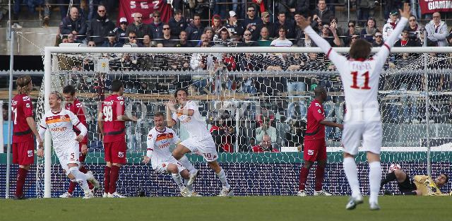 | ITALY, Leghorn : AS Roma's Luca Toni (C-30) celebrates after scoring 2-1 gainst Livorno during their seria A soccer match at Armando Picchi stadium in Leghorn, on March 13, 2010. (AFP PHOTO / FABIO MUZZI) | IMAGE_3840.JPG | 14/03/10 15.23 | |