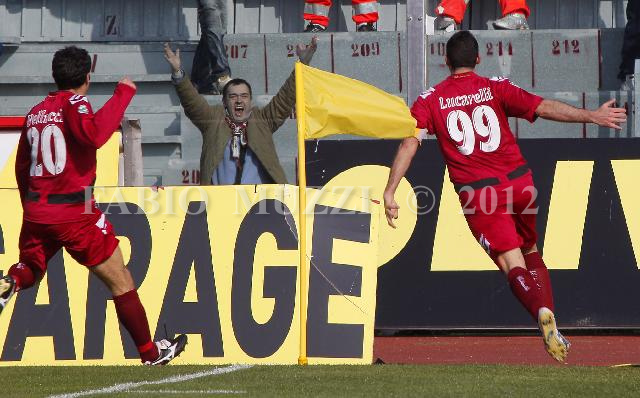 | ITALY, Leghorn : Livorno's Cristiano Lucarelli (R) celebrates after scoring 2-2 against Roma during their seria A soccer match at Armando Picchi stadium in Leghorn, on March 13, 2010. (AFP PHOTO / FABIO MUZZI) | IMAGE_3843.JPG | 14/03/10 15.31 | |