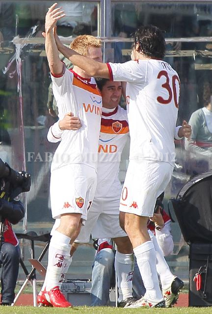 | ITALY, Leghorn : AS Roma's David Pizzarro of Chili (C) is celebrated by teammates John Riise of Norwey (L) and Luca Toni after his score 3-2 against Livorno during their seria A soccer match at Armando Picchi stadium in Leghorn, on March 13, 2010. (AFP PHOTO / FABIO MUZZI) | IMAGE_3846.JPG | 14/03/10 15.32 | |