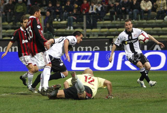 | ITALY, Parma : Parma's Valeri Bojinov of Congo, (3L) strikes against AC Milan's goalkeeper Christian Abbiati (12) during their seria A soccer match at Ennio Tardini stadium in Parma, on March 24, 2010. (AFP PHOTO / FABIO MUZZI) | IMAGE_3862.JPG | 24/03/10 23.30 | |