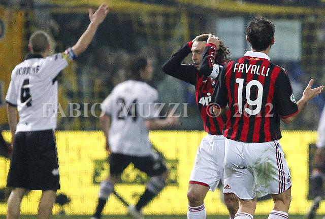| ITALY, Parma : AC Milan's Andrea Pirlo (C) and teammate Giuseppe Favalli reacts after Parma scored 1-0 during their seria A soccer match at Ennio Tardini stadium in Parma, on March 24, 2010. (AFP PHOTO / FABIO MUZZI) | IMAGE_3867.JPG | 24/03/10 22.25 | |