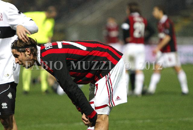 | ITALY, Parma : AC Milan's Luca Antonini (L) and teammates reacts at the end of the match missed against parma for 1-0 in their seria A soccer match at Ennio Tardini stadium in Parma, on March 24, 2010. (AFP PHOTO / FABIO MUZZI) | IMAGE_3868.JPG | 24/03/10 23.24 | |
