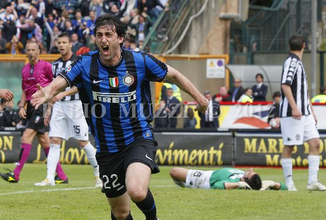 | ITALY, Siena : FC Inter's Diego Milito (C) celebrates after scoring against Siena during their seria A soccer match at Artemio Franchi stadium in Siena, on May 16, 2010. (AFP PHOTO / FABIO MUZZI) | IMAGE_3896.JPG | 16/05/10 15.19 | |