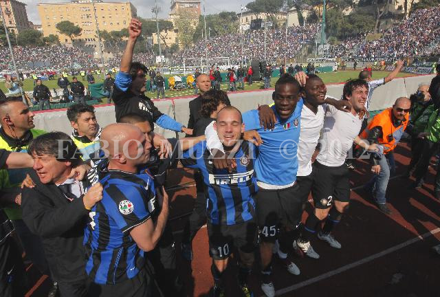 | ITALY, Siena : FC Inter's players celebrates the victory of the 18 italian football championship during their seria A soccer match at Artemio Franchi stadium in Siena, on May 16, 2010. (AFP PHOTO / FABIO MUZZI) | IMAGE_3909.JPG | 16/05/10 15.56 | |