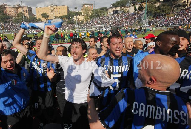 | ITALY, Siena : FC Inter's players celebrates the victory of the 18 italian football championship during their seria A soccer match at Artemio Franchi stadium in Siena, on May 16, 2010. (AFP PHOTO / FABIO MUZZI) | IMAGE_3919.JPG | 16/05/10 15.58 | |