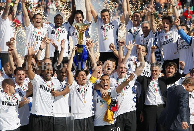 | ITALY, Siena : FC Inter's players celebrates the victory of the 18 italian football championship during their seria A soccer match at Artemio Franchi stadium in Siena, on May 16, 2010. (AFP PHOTO / FABIO MUZZI) | IMAGE_3925.JPG | 16/05/10 16.22 | |