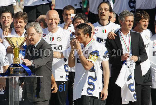 | ITALY, Siena : FC Inter's players celebrates the victory of the 18 italian football championship during their seria A soccer match at Artemio Franchi stadium in Siena, on May 16, 2010. (AFP PHOTO / FABIO MUZZI) | IMAGE_3927.JPG | 16/05/10 16.22 | |