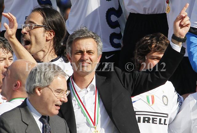 | ITALY, Siena : FC Inter's coach team Maurinho celebrates the victory of the 18 italian football championship during their seria A soccer match at Artemio Franchi stadium in Siena, on May 16, 2010. (AFP PHOTO / FABIO MUZZI) | IMAGE_3929.JPG | 16/05/10 16.22 | |