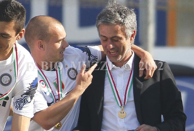 | ITALY, Siena : FC Inter's player celebrates together Maurinho (R) the victory of the 18 italian football championship during their seria A soccer match at Artemio Franchi stadium in Siena, on May 16, 2010. (AFP PHOTO / FABIO MUZZI) | IMAGE_3936.JPG | 16/05/10 16.23 | |