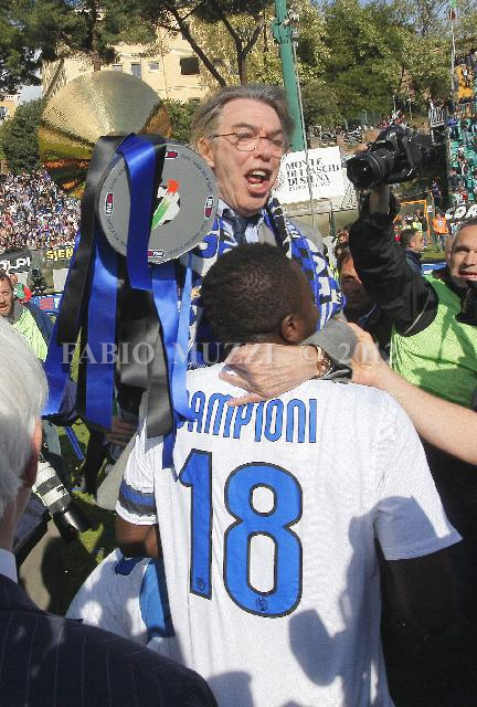 | ITALY, Siena : FC Inter's president Massimo Moratti celebrates the victory of the 18 italian football championship during their seria A soccer match at Artemio Franchi stadium in Siena, on May 16, 2010. (AFP PHOTO / FABIO MUZZI) | IMAGE_3941.JPG | 16/05/10 16.26 | |