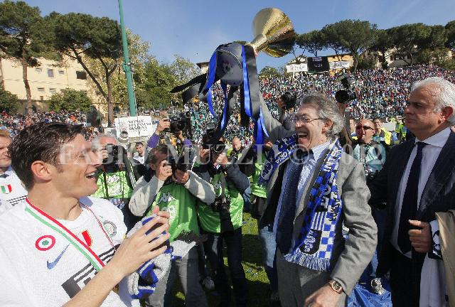 | ITALY, Siena : FC Inter's president Massimo Moratti celebrates the victory of the 18 italian football championship during their seria A soccer match at Artemio Franchi stadium in Siena, on May 16, 2010. (AFP PHOTO / FABIO MUZZI) | IMAGE_3942.JPG | 16/05/10 16.26 | |
