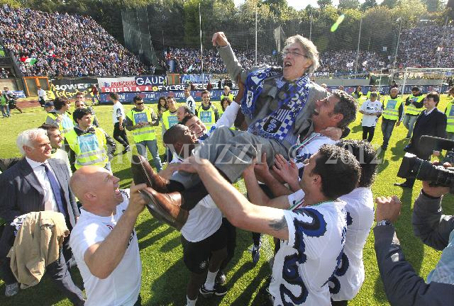 | ITALY, Siena : FC Inter's president Massimo Moratti is celebrated by his teram the victory of the 18 italian football championship during their seria A soccer match at Artemio Franchi stadium in Siena, on May 16, 2010. (AFP PHOTO / FABIO MUZZI) | IMAGE_3944.JPG | 16/05/10 16.25 | |