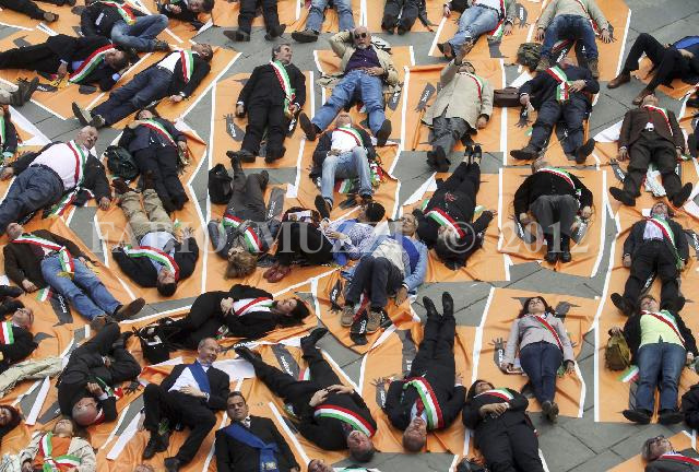 | ITALY, Florence : Mayors of Italian regions as Tuscany, Marche, Lazio, Abruzzo, Emilia Romagna, Umbria, sit in on the Signoria Square in Florence on May 20, 2010. Mayors protest against the rigidity of the Stability Pact established by Italian Government. AFP PHOTO / FABIO MUZZI | IMAGE_3954.JPG | | |