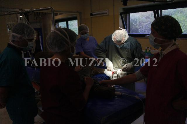 | ITALY, Siena : veterinary doctor Raffaele Ciampoli (2R) operates an injuried horse at the veterinary horse hospital "il Ceppo" on June 21, 2010. The Palio of Siena (known locally simply as Il Palio) is a horse race held twice each year on July 2 and August 16 in Siena, Italy, in which ten horses and riders, dressed in the appropriate colours, represent ten of the seventeen Contrade (the medieval Siena district), or city wards. (AFP PHOTO / FABIO MUZZI) | IMAGE_3961.JPG | 21/06/10 10.42 | |