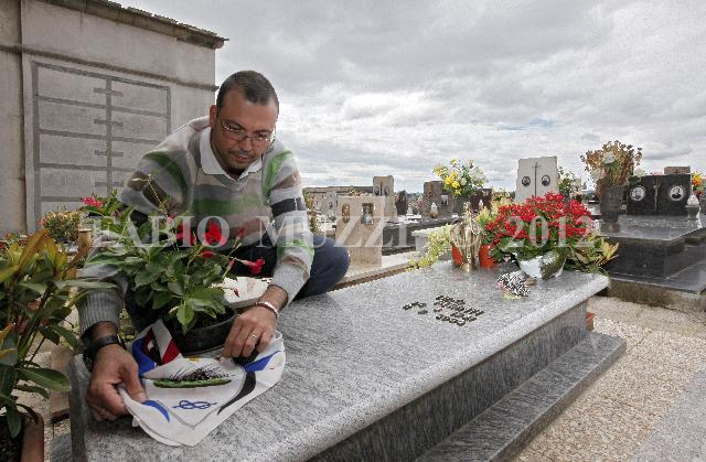 | ITALY, Siena : Fabio Perinti disposes a flag of the Contrada of Porcupine ( Contrada is a medieval district of Siena city) upon the grave of is father, capitan of this Contrada, deceased on 2008, on June 21, 2010. The Palio of Siena (known locally simply as Il Palio) is a horse race held twice each year on July 2 and August 16 in Siena, Italy, in which ten horses and riders, dressed in the appropriate colours, represent ten of the seventeen Contrade (the medieval Siena district), or city wards. (AFP PHOTO / FABIO MUZZI) | IMAGE_3964.JPG | 21/06/10 14.12 | |