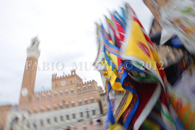 | ITALY, Siena : Souvenirs of flags of the Contrade of Siena ( Contrada is a medieval district of Siena city), flaps in the square " Il Campo" with the main tower and the council of Siena in background, on June 21, 2010. In this square, the Palio of Siena (known locally simply as Il Palio) is a horse race held twice each year on July 2 and August 16 in Siena, Italy, in which ten horses and riders, dressed in the appropriate colours, represent ten of the seventeen Contrade (the medieval Siena district), or city wards. (AFP PHOTO / FABIO MUZZI) | IMAGE_3967.JPG | 21/06/10 15.44 | |