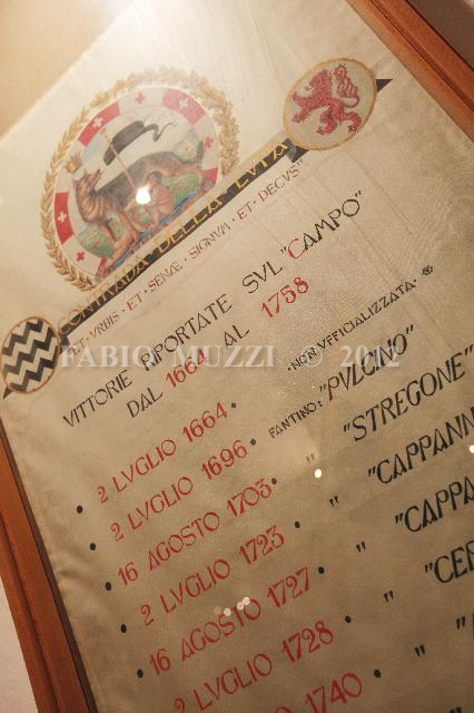 | ITALY, Siena : Inside the museum of the Contrada of Wolf ( Contrada is a medieval district of Siena city ), an old papyrus reporting data of the first horse races victory of the Palio, on June 21, 2010. The Palio of Siena (known locally simply as Il Palio) is a horse race held twice each year on July 2 and August 16 in Siena, Italy, in which ten horses and riders, dressed in the appropriate colours, represent ten of the seventeen Contrade (the medieval Siena district), or city wards. (AFP PHOTO / FABIO MUZZI) | IMAGE_3972.JPG | 21/06/10 17.42 | |