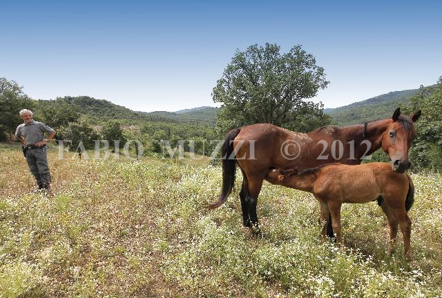 | ITALY, Radicondoli : from left, chief inspector forest guard Fabrizio Leonardelli looks a female horse nurses her foal at the pension-house of the horses of the Palio of Siena, on June 22, 2010 The Palio of Siena (known locally simply as Il Palio) is a horse race held twice each year on July 2 and August 16 in Siena, Italy, in which ten horses and riders, dressed in the appropriate colours, represent ten of the seventeen Contrade (the medieval Siena district), or city wards. (AFP PHOTO / FABIO MUZZI) | IMAGE_3976.JPG | 22/06/10 10.11 | |