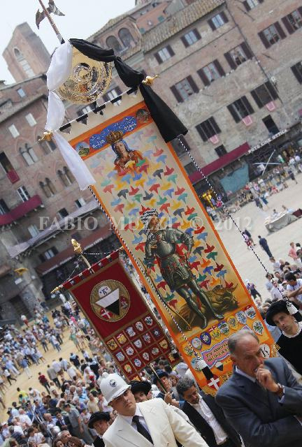 | ITALY, Siena : The painting of the Palio, center, is carried by Contrade ( Siena district ) moving from the Il Campo square to Provenzano's church to be blessed by the local priest of the church. The Palio is a horse race held twice a year on July 2 and August 16 in Siena, Italy, in which 10 horses and riders represent 10 of the 17 medieval Siena districts, in Siena on July 01, 2010. AFP PHOTO / FABIO MUZZI | IMAGE_3981.JPG | 01/07/10 16.43 | |