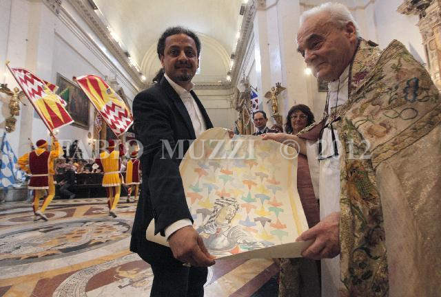 | ITALY, Siena : the painter of the Palio arab Ali' Hassoun (L) donates to the priest of Provenzano's church Enzo Carli the sketch of the Palio. The Palio is a horse race held twice a year on July 2 and August 16 in Siena, Italy, in which 10 horses and riders represent 10 of the 17 medieval Siena districts, in Siena on July 01, 2010. AFP PHOTO / FABIO MUZZI | IMAGE_3985.JPG | 01/07/10 17.07 | |