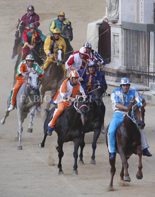 | ITALY, Siena : a passage of the horses of the Contrada during the the Palio of Siena horses race on July 02, 2010. The Palio is a medieval horse race and peageant, which pits the ancient districts of Siena against each other in competition for the victory banner and in honor of the Virgin Mary. (AFP Photo / FABIO MUZZI ) | IMAGE_3988.JPG | 02/07/10 19.00 | |