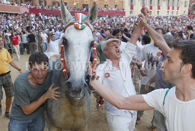 | ITALY, Siena : People of the Contrada of Forest celebrates the victory of the race together their horse Fedora Saura at the end of the Palio of Siena horses race on July 02, 2010. The Palio is a medieval horse race and peageant, which pits the ancient districts of Siena against each other in competition for the victory banner and in honor of the Virgin Mary. (AFP Photo / FABIO MUZZI ) | IMAGE_3991.JPG | 02/07/10 19.03 | |