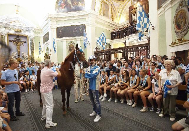 | ITALY, Siena : The blessing into the church of the horse of the Contrada of Wave before the race of the Palio of Siena horses race on July 02, 2010. The Palio is a medieval horse race and peageant, which pits the ancient districts of Siena against each other in competition for the victory banner and in honor of the Virgin Mary. (AFP Photo / FABIO MUZZI ) | IMAGE_3994.JPG | 02/07/10 13.42 | |