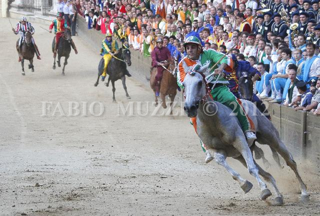 | ITALY, Siena : from right, the jockey Silvano Mulas with the horse Fedora Saura of the Contrada of Forest win the Palio of Siena horses race on July 02, 2010. The Palio is a medieval horse race and peageant, which pits the ancient districts of Siena against each other in competition for the victory banner and in honor of the Virgin Mary. (AFP Photo / FABIO MUZZI ) | IMAGE_3995.JPG | 02/07/10 19.01 | |