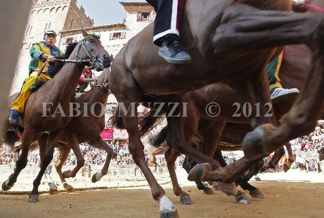 | ITALY, Siena : The horses start the fourth training race in the main square at the "Il Campo", prior of the Palio horse race in Siena on August 15, 2010. The Palio of Siena (known locally simply as Il Palio) is a horse race held twice each year on July 2 and August 16 in Siena, Italy, in which ten horses and riders, dressed in the appropriate colours, represent ten of the seventeen Contrade (the medieval Siena district), or city wards. AFP PHOTO / FABIO MUZZI | IMAGE_4014.JPG | 15/08/10 8.37 | |