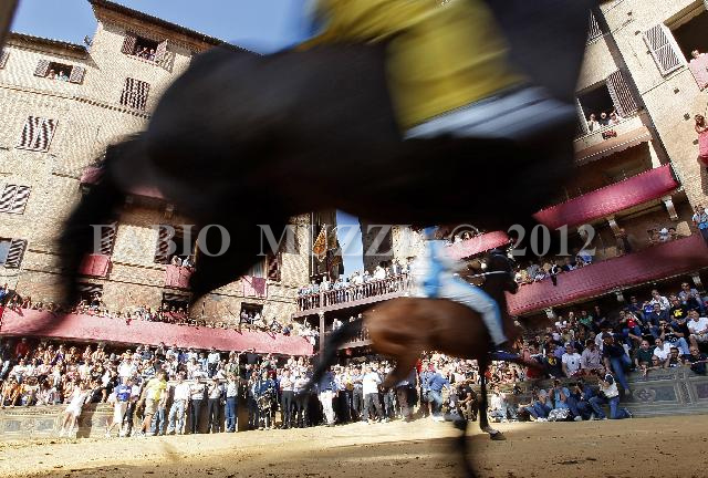 | ITALY, Siena : The horses run in the fourth training race in the main square at the "Il Campo", prior of the Palio horse race in Siena on August 15, 2010. The Palio of Siena (known locally simply as Il Palio) is a horse race held twice each year on July 2 and August 16 in Siena, Italy, in which ten horses and riders, dressed in the appropriate colours, represent ten of the seventeen Contrade (the medieval Siena district), or city wards. AFP PHOTO / FABIO MUZZI | IMAGE_4015.JPG | 15/08/10 8.39 | |