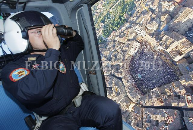 | ITALY, Siena : Italian policeman aboard of a military helicopter watches to control the other than 30.000 people that assist at the General practice horses race inside the main square "Il Campo", prior the Palio horse race in Siena on August 15, 2010. The Palio of Siena (known locally simply as Il Palio) is a horse race held twice each year on July 2 and August 16 in Siena, Italy, in which ten horses and riders, dressed in the appropriate colours, represent ten of the seventeen Contrade (the medieval Siena district), or city wards. AFP PHOTO / FABIO MUZZI | IMAGE_4017.JPG | 15/08/10 17.41 | |