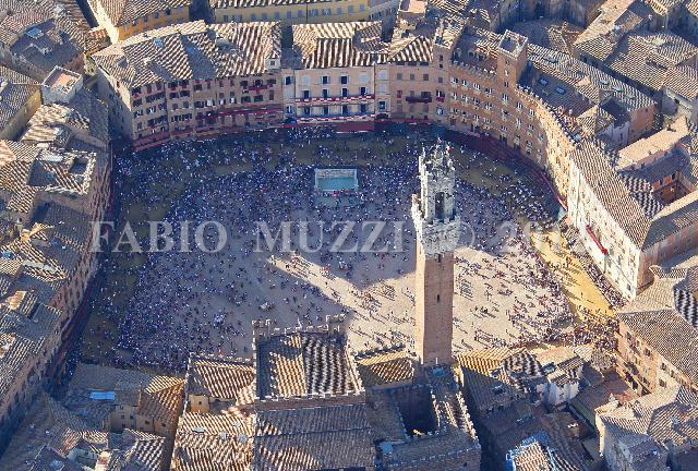 | ITALY, Siena : Aereal view from aboard of a military helicopter of the town of Siena and the main square " Il Campo" where other than 30.000 people that assist at the General practice horses race, prior the Palio horse race in Siena on August 15, 2010. The Palio of Siena (known locally simply as Il Palio) is a horse race held twice each year on July 2 and August 16 in Siena, Italy, in which ten horses and riders, dressed in the appropriate colours, represent ten of the seventeen Contrade (the medieval Siena district), or city wards. AFP PHOTO / FABIO MUZZI | IMAGE_4018.JPG | 15/08/10 17.10 | |