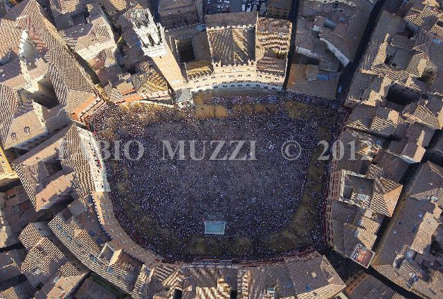 | ITALY, Siena : Aereal view from aboard of a military helicopter of the town of Siena and the main square " Il Campo" where other than 30.000 people that assist at the General practice horses race, prior the Palio horse race in Siena on August 15, 2010. The Palio of Siena (known locally simply as Il Palio) is a horse race held twice each year on July 2 and August 16 in Siena, Italy, in which ten horses and riders, dressed in the appropriate colours, represent ten of the seventeen Contrade (the medieval Siena district), or city wards. AFP PHOTO / FABIO MUZZI | IMAGE_4020.JPG | 15/08/10 17.48 | |