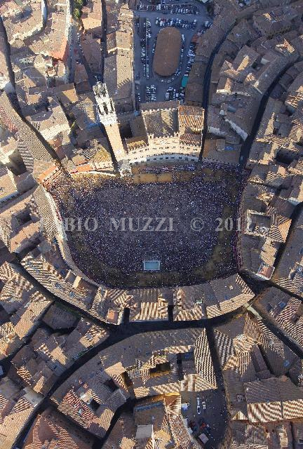 | ITALY, Siena : Aereal view from aboard of a military helicopter of the town of Siena and the main square " Il Campo" where other than 30.000 people that assist at the General practice horses race, prior the Palio horse race in Siena on August 15, 2010. The Palio of Siena (known locally simply as Il Palio) is a horse race held twice each year on July 2 and August 16 in Siena, Italy, in which ten horses and riders, dressed in the appropriate colours, represent ten of the seventeen Contrade (the medieval Siena district), or city wards. AFP PHOTO / FABIO MUZZI | IMAGE_4021.JPG | 15/08/10 17.50 | |