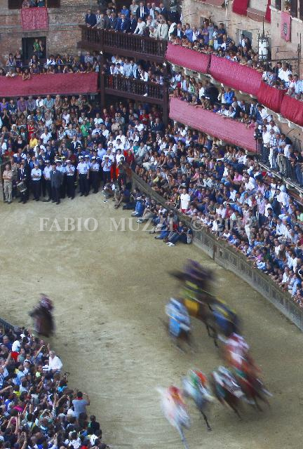 | ITALY, Siena : A view ot the start during the General practice horses race, prior the Palio horse race in Siena on August 15, 2010. The Palio of Siena (known locally simply as Il Palio) is a horse race held twice each year on July 2 and August 16 in Siena, Italy, in which ten horses and riders, dressed in the appropriate colours, represent ten of the seventeen Contrade (the medieval Siena district), or city wards. AFP PHOTO / FABIO MUZZI | IMAGE_4023.JPG | 15/08/10 18.38 | |