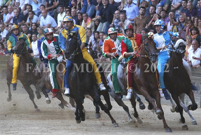 | ITALY, Siena : The horses during the race of Palio in Siena on August 16, 2010. The Palio of Siena (known locally simply as Il Palio) is a horse race held twice each year on July 2 and August 16 in Siena, Italy, in which ten horses and riders, dressed in the appropriate colours, represent ten of the seventeen Contrade (the medieval Siena district), or city wards. AFP PHOTO / FABIO MUZZI | IMAGE_4035.JPG | 16/08/10 18.52 | |
