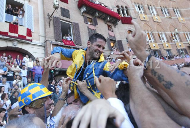 | ITALY, Siena : The jockey of the Contrada of Tortoise Luigi Bruschelli is celebrated by Contradaioli after the victory of the race of the Palio n Siena on August 16, 2010. The Palio of Siena (known locally simply as Il Palio) is a horse race held twice each year on July 2 and August 16 in Siena, Italy, in which ten horses and riders, dressed in the appropriate colours, represent ten of the seventeen Contrade (the medieval Siena district), or city wards. AFP PHOTO / FABIO MUZZI | IMAGE_4044.JPG | 16/08/10 18.55 | |