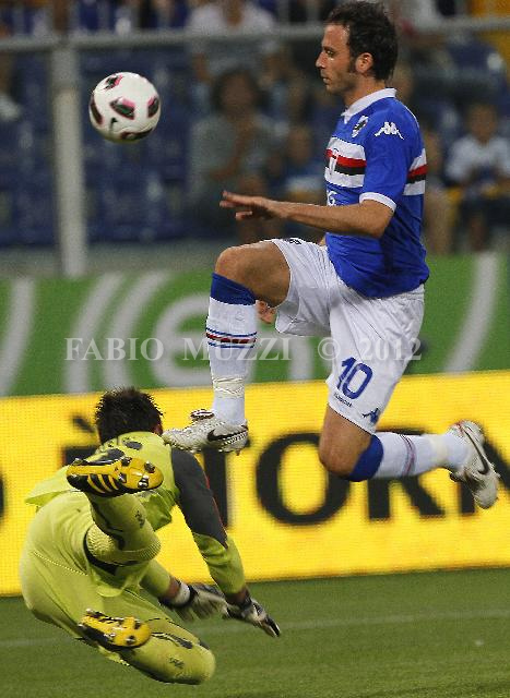 | ITALY, Genova : Sampdoria's Gianluca Pazzini (L) in action against Lazio's goalkeeper Gianluca Curci during their serie A football match at Luigi Ferraris stadium in Genova on August 29, 2010. AFP PHOTO / FABIO MUZZI | IMAGE_4046.JPG | 29/08/10 19.48 | |