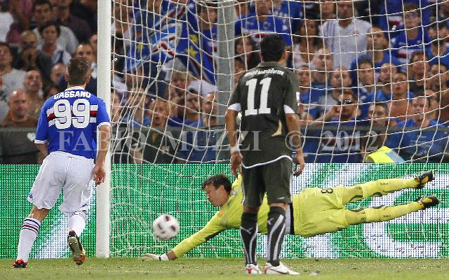 | ITALY, Genova : Sampdoria's Antonio Cassano (L) scores on penalty against Lazio's uruguaian goalkeeper Fernando Muslera during their serie A football match at Luigi Ferraris stadium in Genova on August 29, 2010. AFP PHOTO / FABIO MUZZI | IMAGE_4056.JPG | 29/08/10 21.02 | |