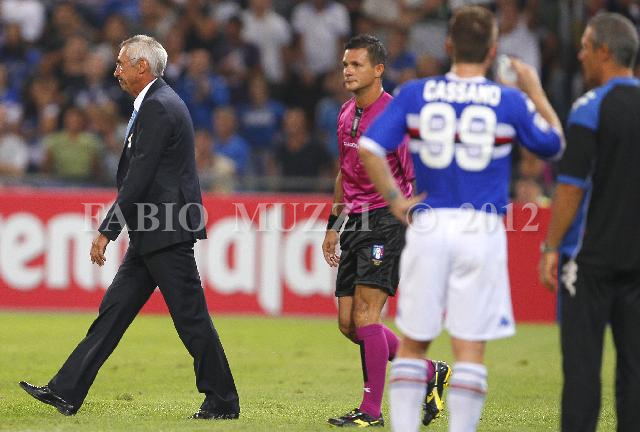 | ITALY, Genova : Lazio's coach Edoardo Reja (L) go out from the pitch after received a red card by italian referee Andrea Romeo during their serie A football match at Luigi Ferraris stadium in Genova on August 29, 2010. AFP PHOTO / FABIO MUZZI | IMAGE_4057.JPG | 29/08/10 21.03 | |